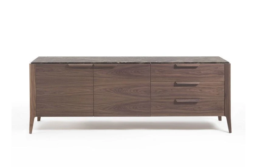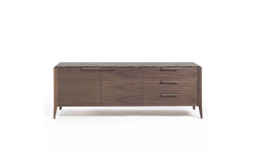 The sideboard is topped with a beautifully veined sheet of Emperador marble. Defined by its brown finish, this luxurious marble is often quarried in Turkey and Spain.