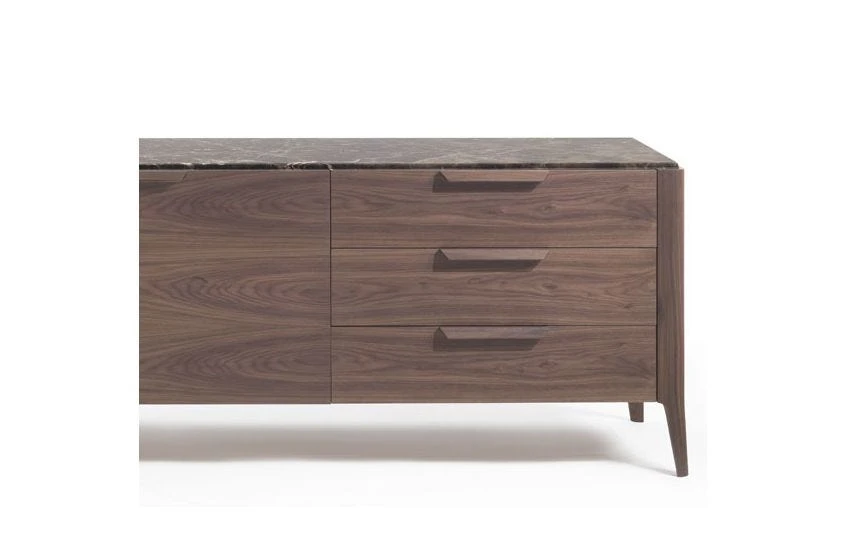 Designed by Carlo Ballabio for Porada, this Atlante 3 Sideboard is crafted from canaletta walnut with an Emperador dark marble surface.
