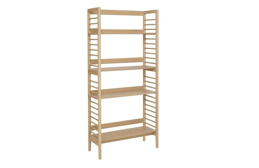 Featuring four shelves of different heights and spindled sides, the pared-back shelves are the perfect addition to living and dining spaces alike.