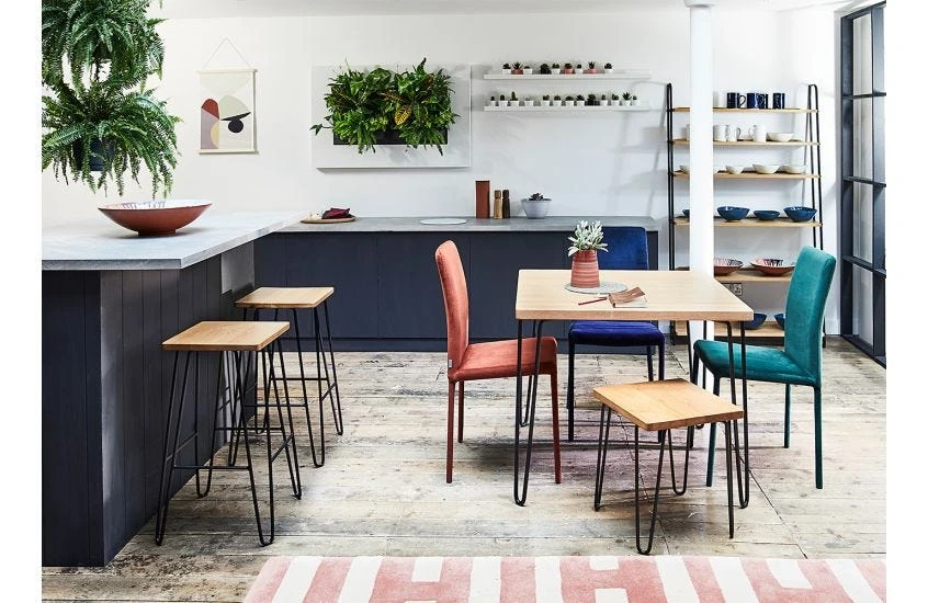 Part of Brunel Dining Range includes stools and bench that fit perfectly in a modern dining room