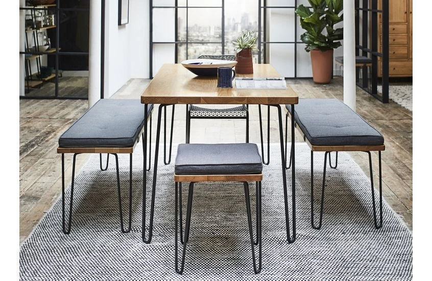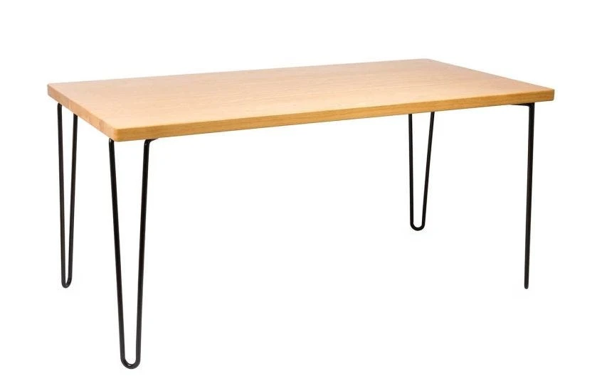 Powder coated black steel hairpin legs create an industrial style base for the table.