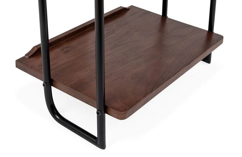The solid dark-stained American-oak shelves have lipped edges, and are arranged on an industrial style brushed metal frame.