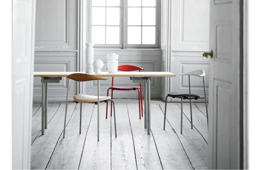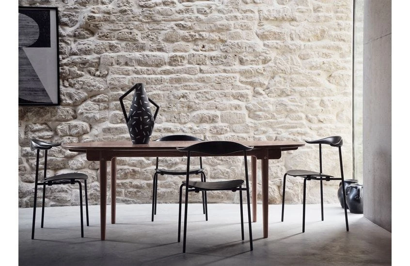 The CH88T is versatile, elegant and functional. Its convenient stackable design seamlessly joins wood and industrial steel, showcasing Wegner’s skill in lending softness to minimalist forms. The steel frame supports an oval wooden seat and steam-bent backrest with elegantly upturned ends forming a natural resting place for the forearms.