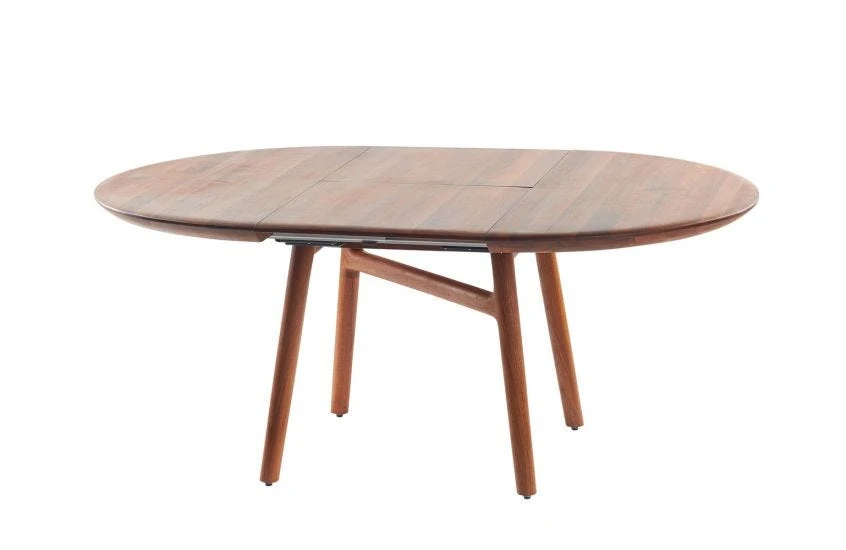 This solid walnut round table boats a beautifully concealed leaf.