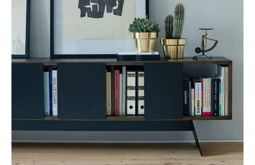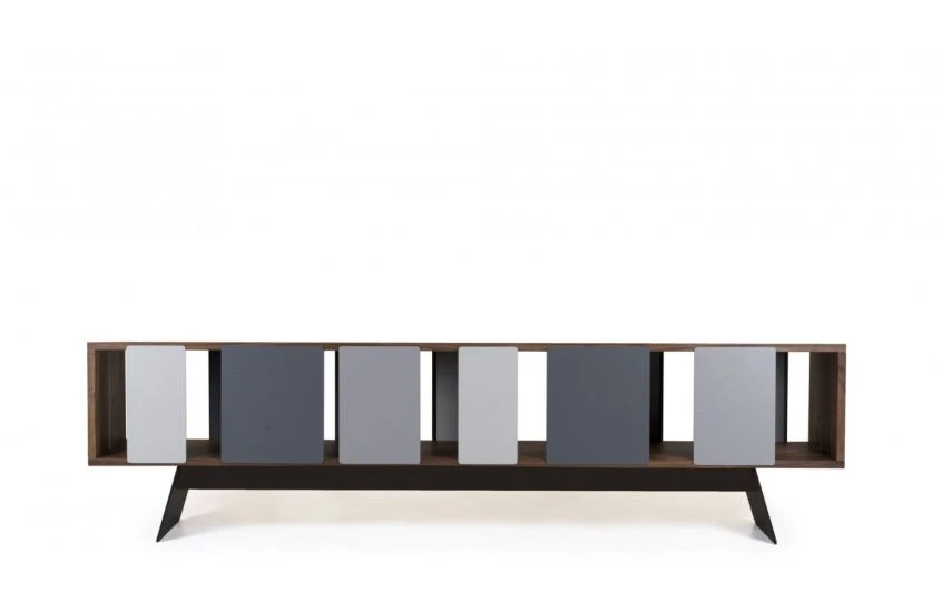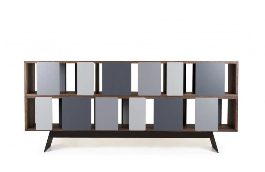 - Sliding panels move across the cabinet to create a unique display.