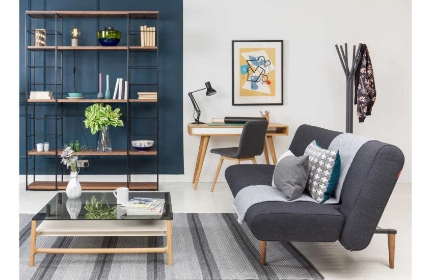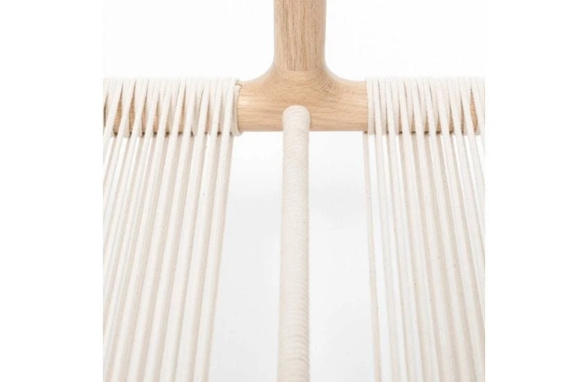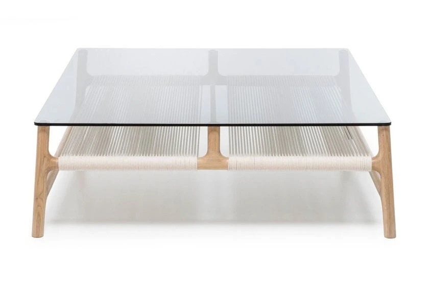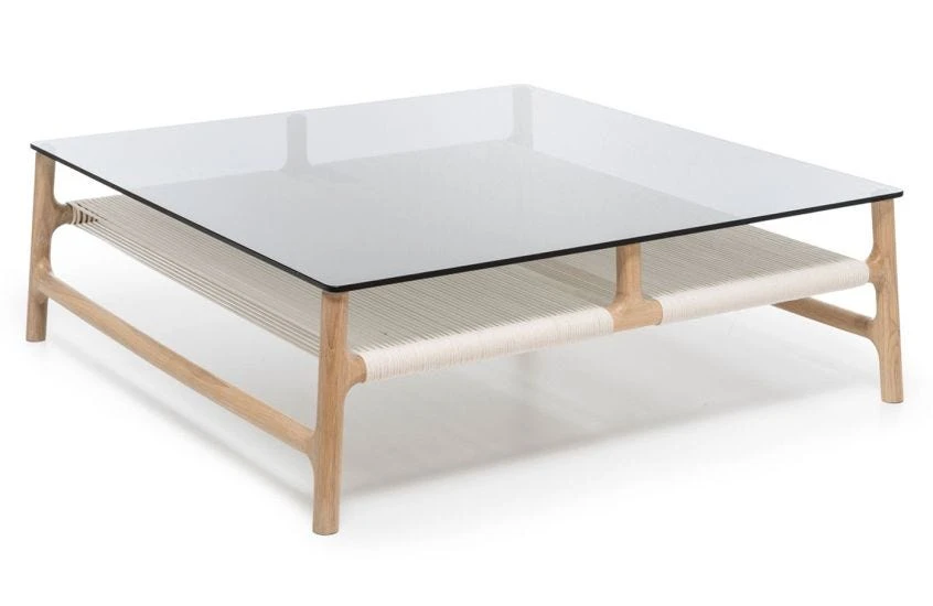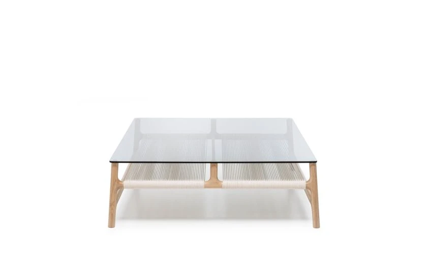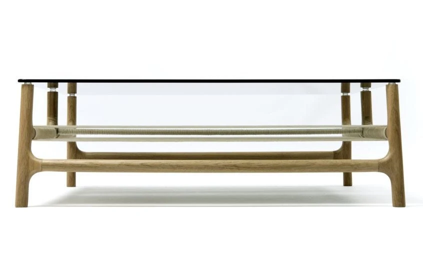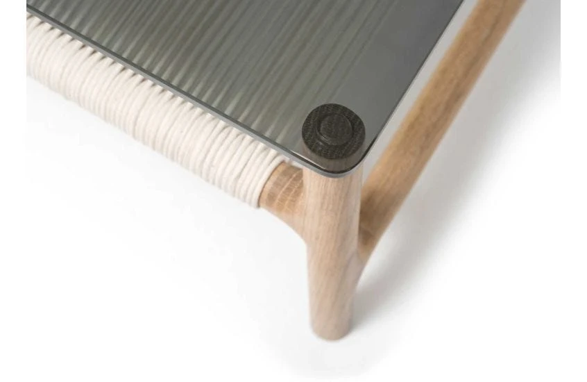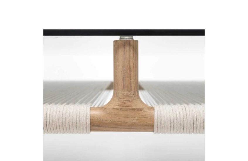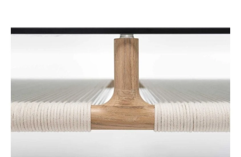 Thick glass table top complimented with slender White Oiled Oak frame and flexible rope shelf.