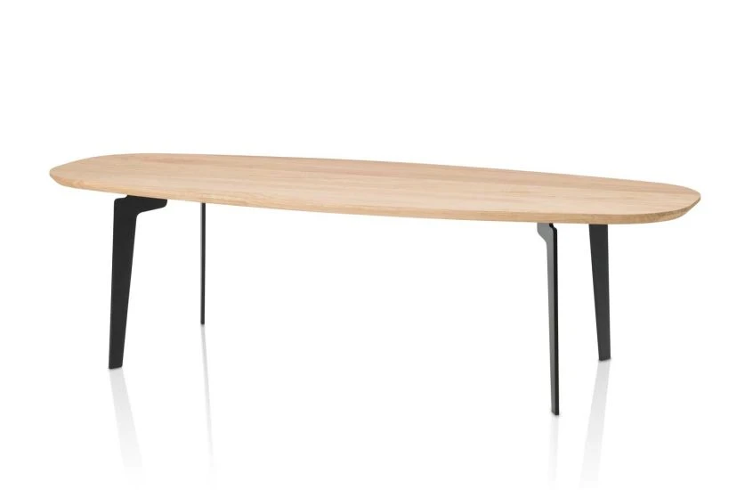 Crafted from solid oak, the simple profile of the table top has smooth, angled edging and is finished with a clear lacquer that makes it hard wearing for years to come.