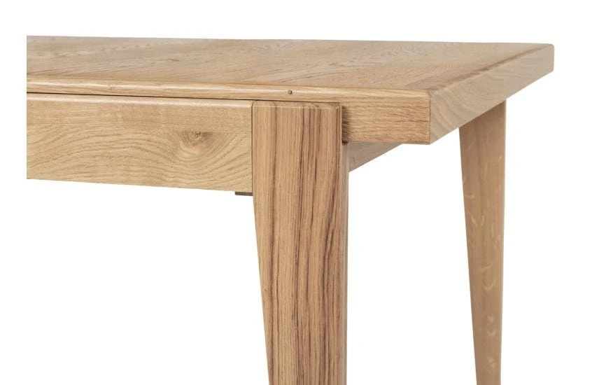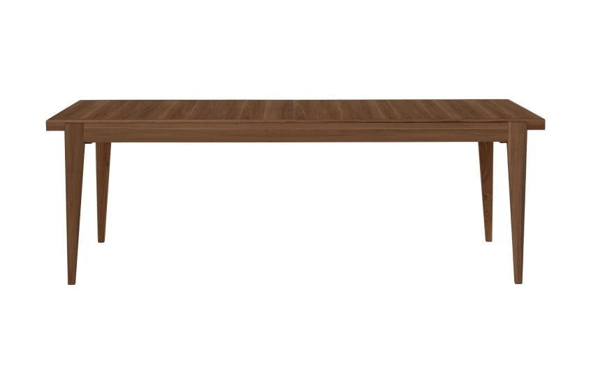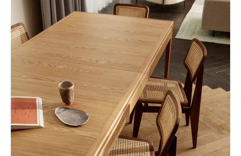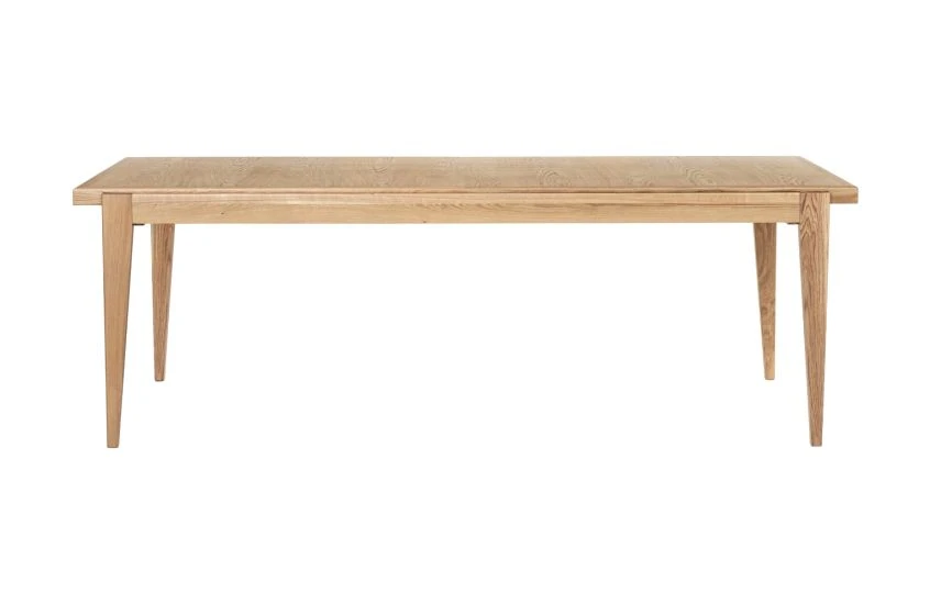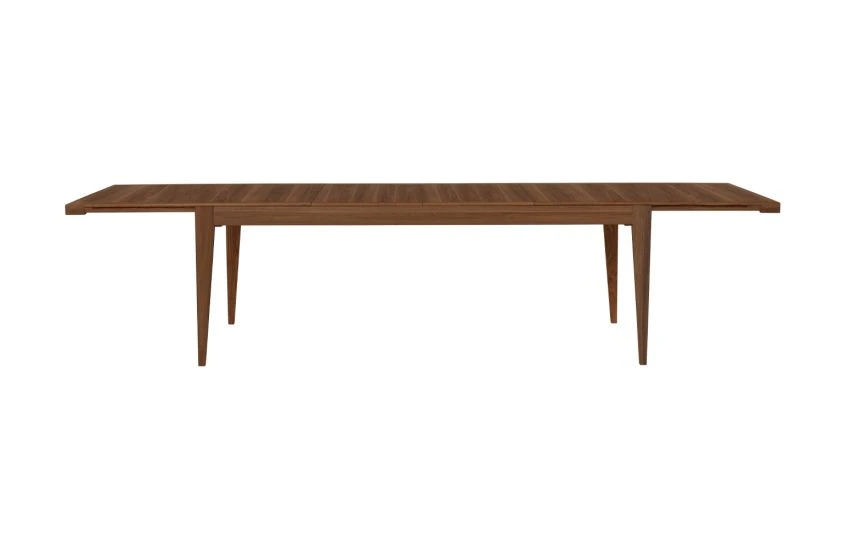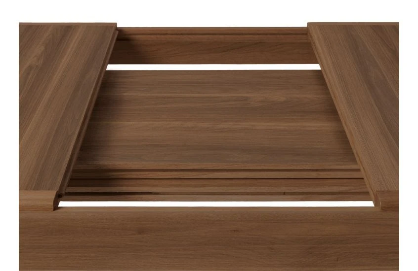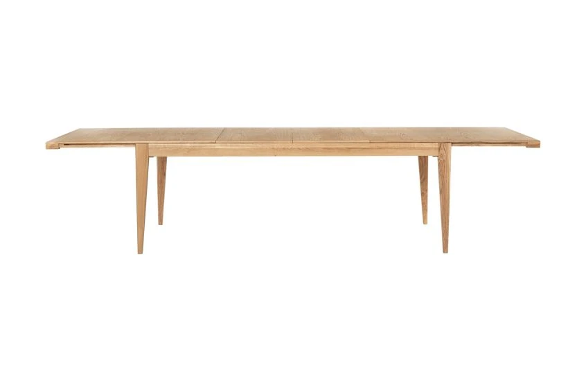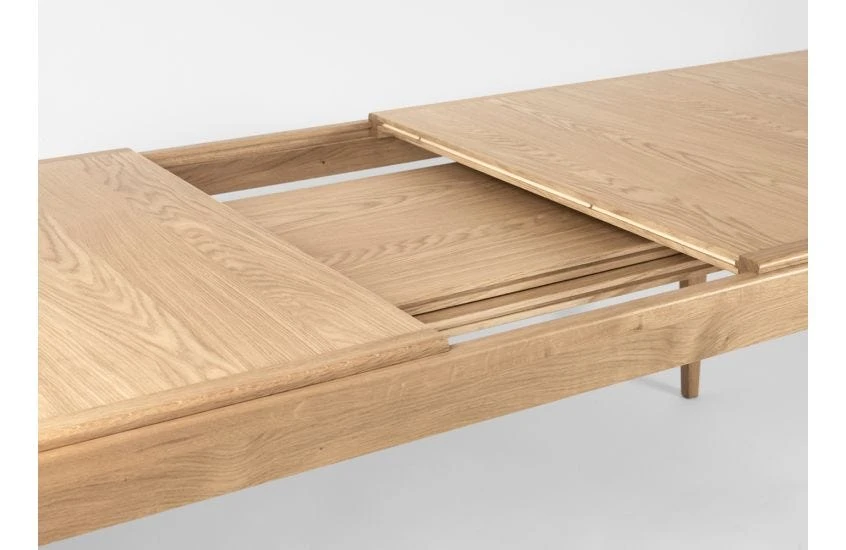 - The table top splits in the centre and slides apart, creating space for up to two extension leaves.