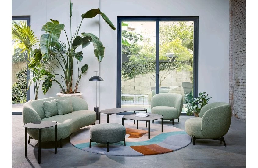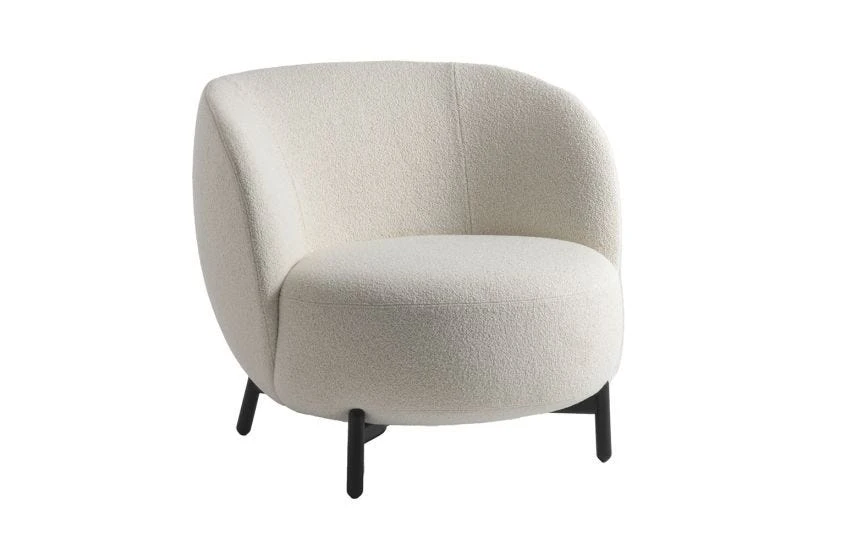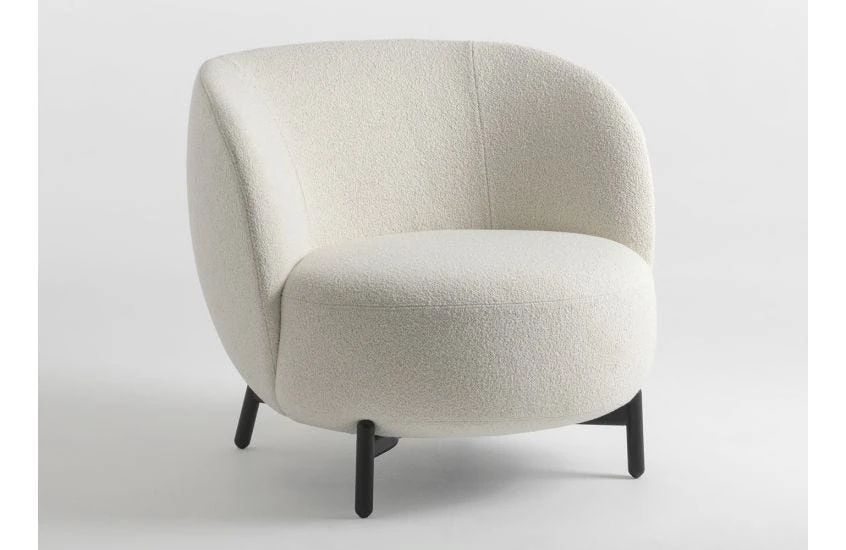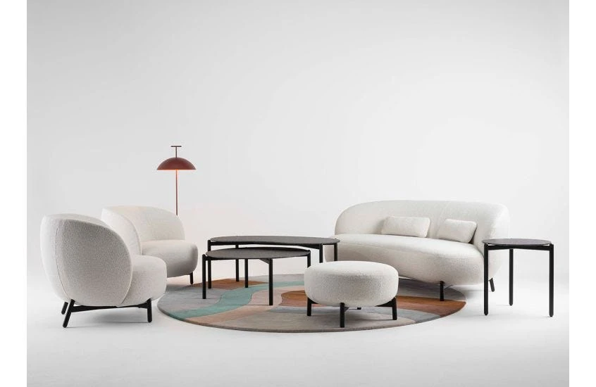 Sofa, armchair and pouffe come in soft bouclé fabric.