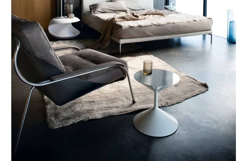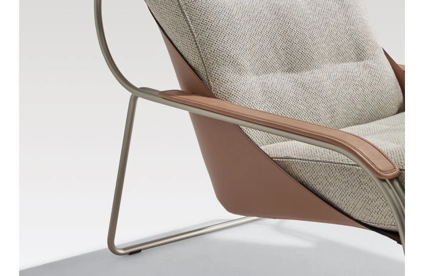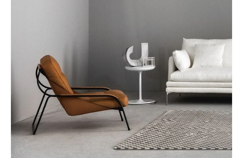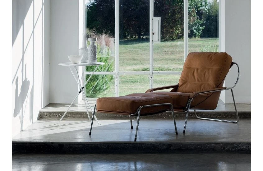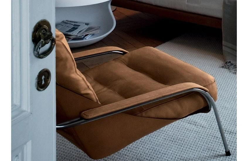 Starting from the hypothesis of an inexpensive, dismantlable armchair, the Maggiolina was designed by Marco Zanuso towards the end of the 1940s for a competition held by the MoMA of New York. It had a structure of curved steel tubing from which a burlap ‘bag’ was hung, the ‘pockets’ of which contained two panels of plywood, inserted to support the two padded cushions used as seat and backrest.