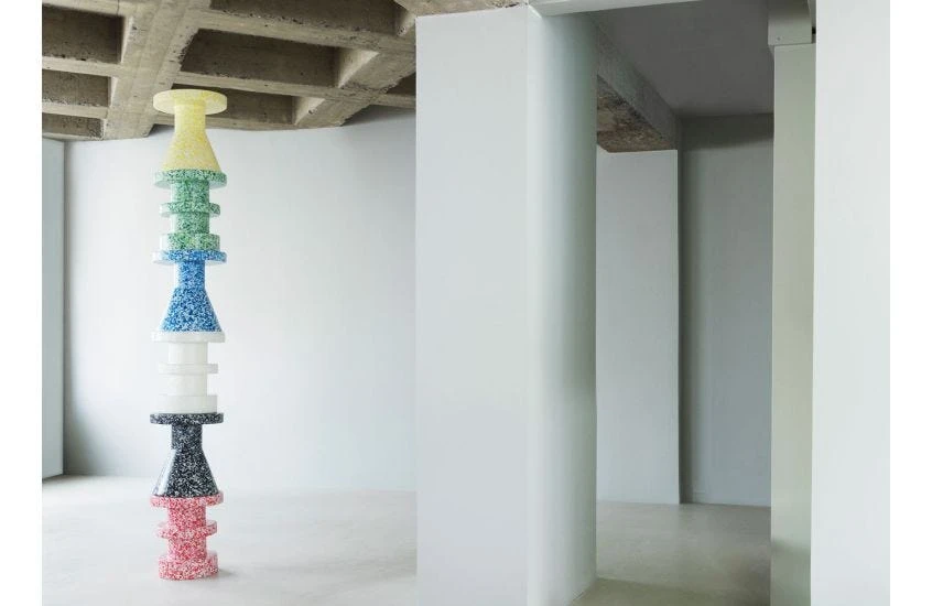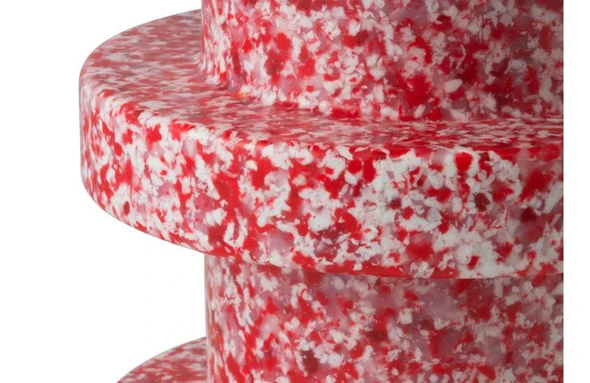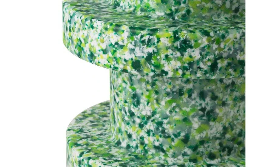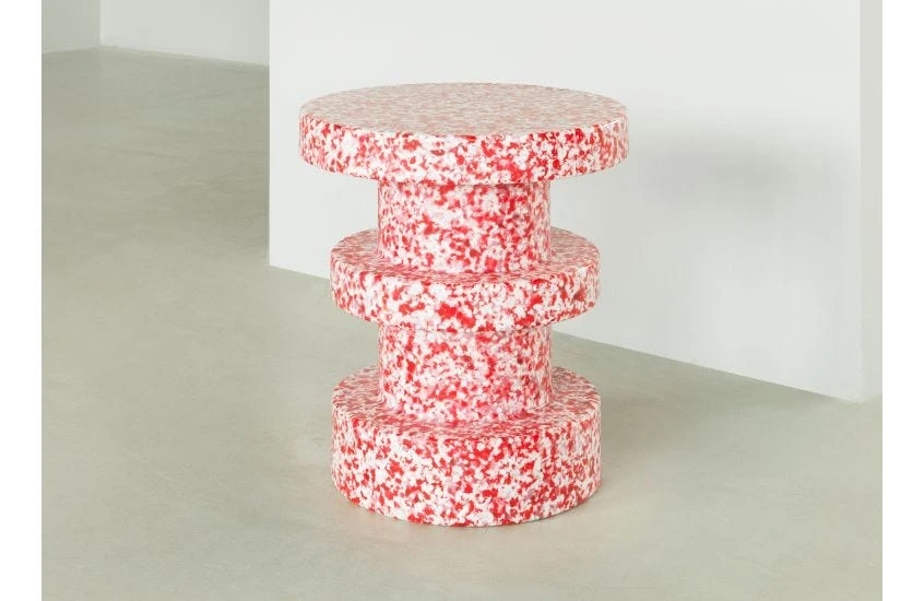 The straightforward, utilitarian look contrasts with the pixelated surface made up of small bits of 100% recycled household and industrial plastic.