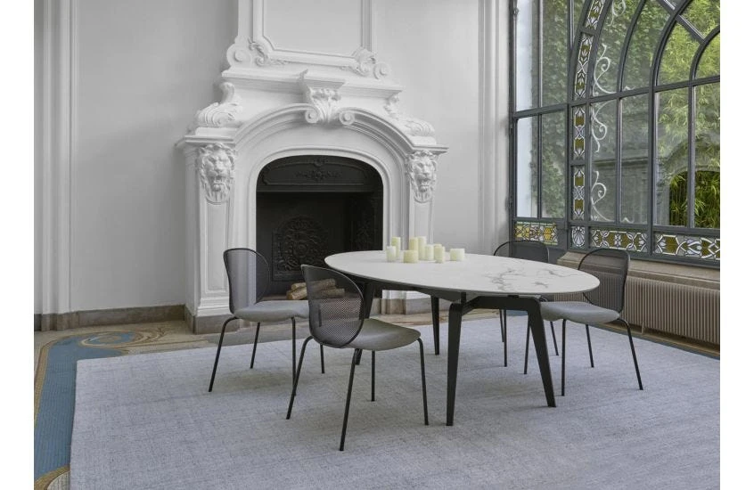 Designed by Mauro Lipparini for Ligne Roset, this Odessa Dining Table boasts a minimalist design that’s ideal for contemporary spaces. The elegant tabletop is angled like an airplane wing, an effect that makes it appear as though floating above the folded steel legs. Overall, the table’s clean-cut silhouette and dynamic lines make it a refined addition to any dining space.