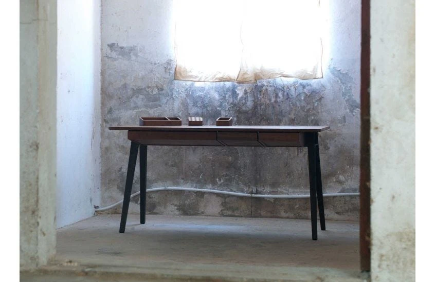 Three solid wood drawers for storage and three small compartments at the back of the desk.