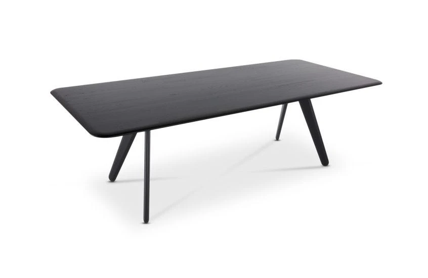 The contemporary form of the Slab Dining Table is supported by intentionally splayed legs.