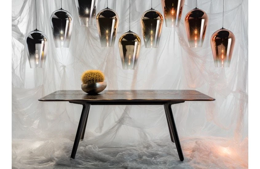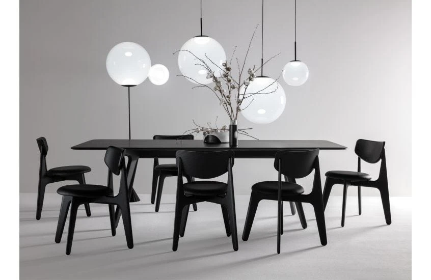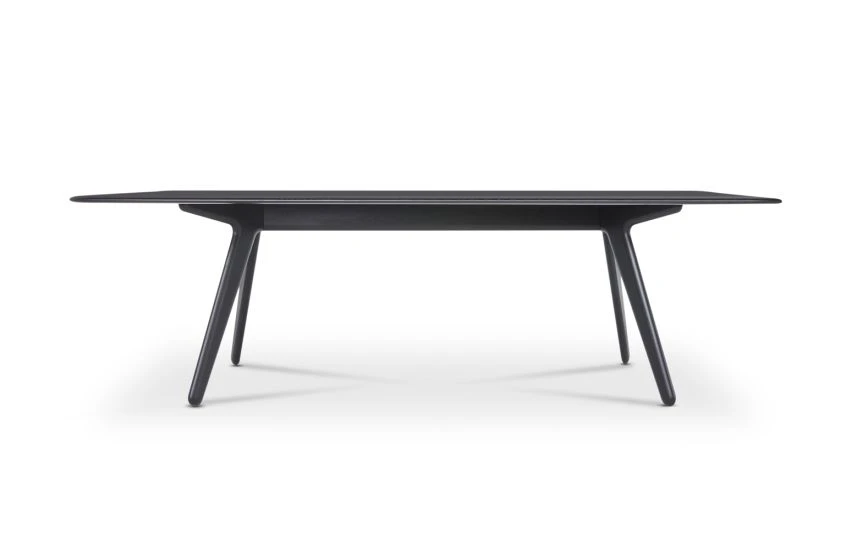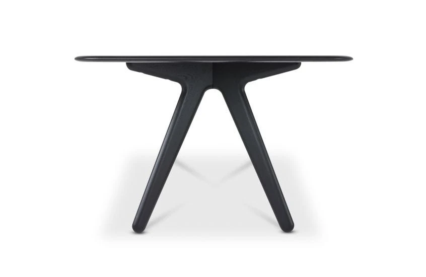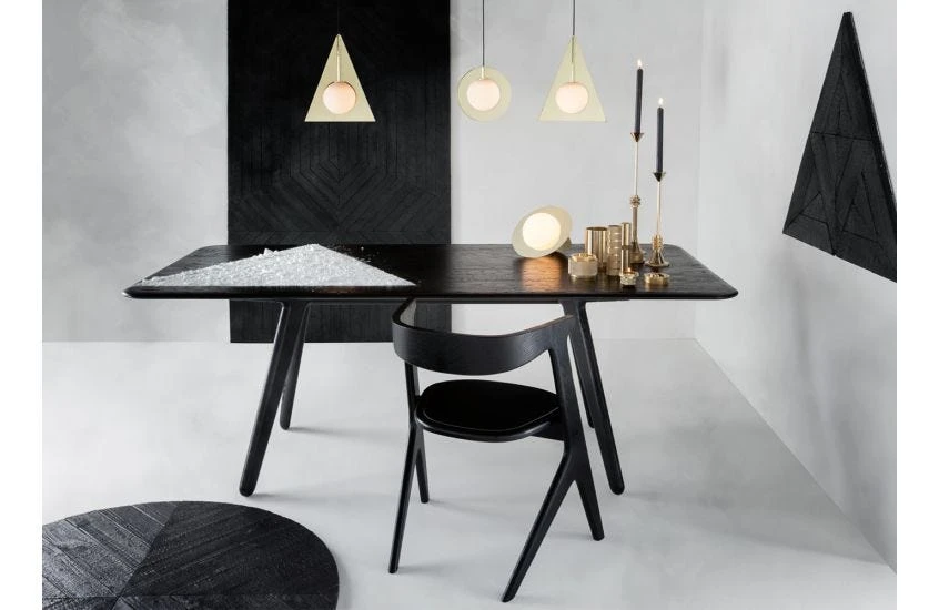 Solid oak finished in a black lacquer lends a clean but textured surface to the table.