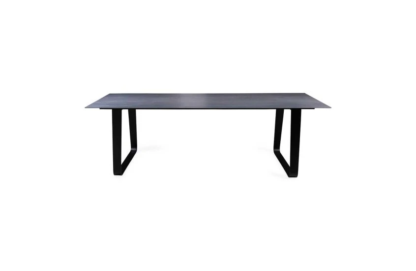 The top, which overhangs by around 12 cm, renders the structure barely visible. The designers present Vilna as an innovative table, a design object, with its overhanging top and sharp-looking metal base.