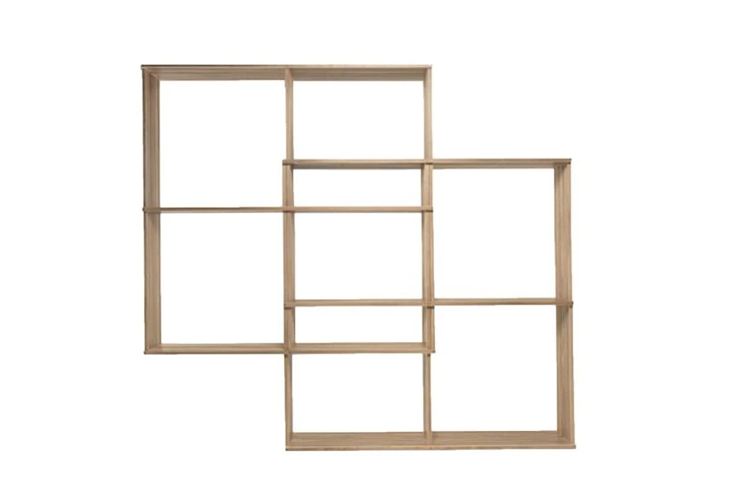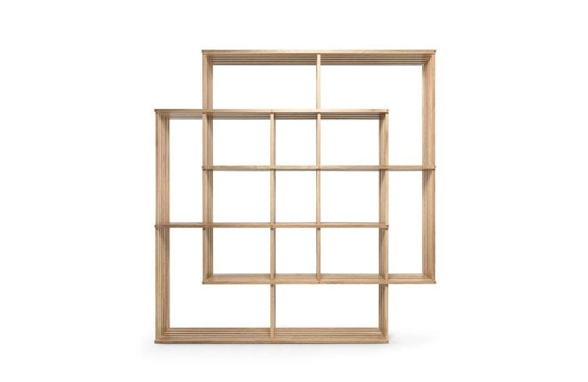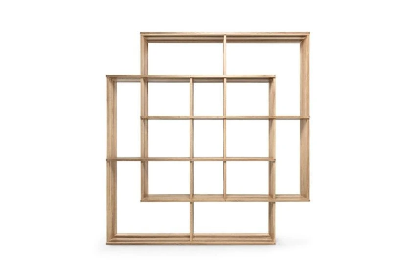 The shelf is fashioned using 48 oak wood slats with brass screws that allow the blocks to move easily. The entire unit is finished with oil and further enhanced with UV protection.